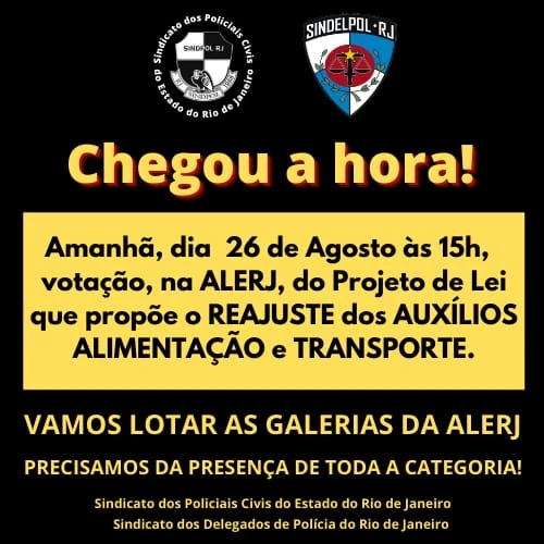 A Assembleia Legislativa do Estado do Rio de Janeiro votará amanhã (26/08) o Projeto de Lei nº 4668/2021, cujo texto é de iniciativa dos Deputados Carlos Augusto e Martha Rocha versa sobre a majoração dos auxílios alimentação e transporte dos policiais civis, não reajustados desde o ano de 2011.